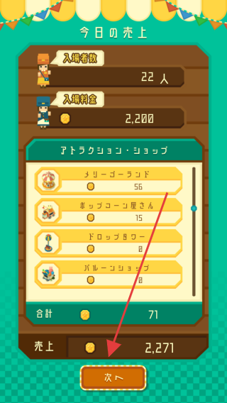 3、在游戲的今日の売上今日的銷售額界面,你可以查看入園人數(shù)、入園料金、各游樂設(shè)施的銷售額等信息,點擊次へ按鈕,繼續(xù)進行公園的經(jīng)營管理,提升公園的收益和等級。
