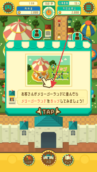 2、在游戲過程中,會有提示信息,當(dāng)客人在旋轉(zhuǎn)木馬排隊時,試著點擊旋轉(zhuǎn)木馬吧!,根據(jù)提示進行操作,管理公園的游樂設(shè)施,吸引更多客人。