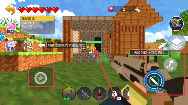 3、在游戲操作中,通過右側(cè)的功能按鈕切換攻擊模式和建造模式,選擇武器進(jìn)行攻擊,同時(shí)可以選擇創(chuàng)建怪物和陷阱,完成游戲任務(wù),提升你的游戲體驗(yàn)。