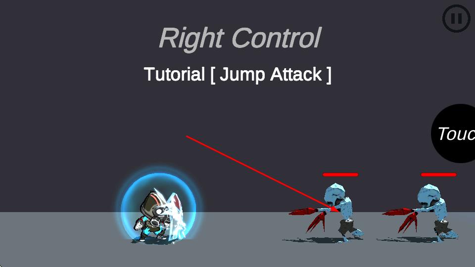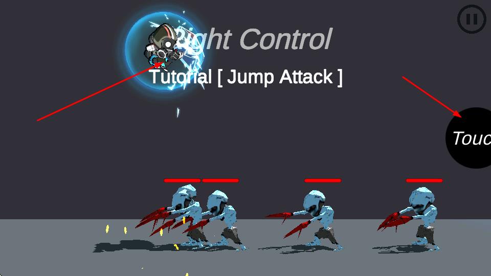 2、跟隨Right Control Jump Attack指引,點(diǎn)擊右側(cè)Touch區(qū)域,觸發(fā)角色跳躍攻擊:角色躍起并釋放技能,攻擊前方敵方單位持紅刃的藍(lán)色小怪。