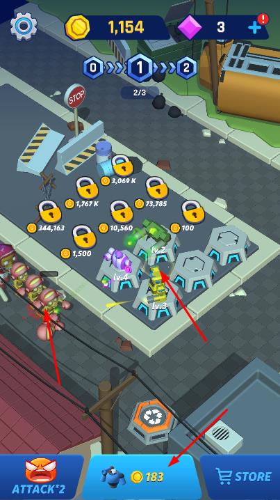 3、在僵尸入侵時,合理利用已建造和升級的防御設(shè)施抵御僵尸侵害,持續(xù)抵御僵尸,完成關(guān)卡目標,進入下一關(guān)卡,體驗更多塔防樂趣。