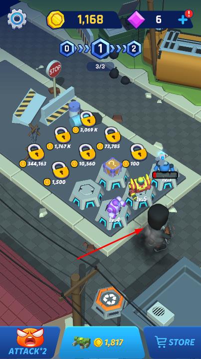 1、進入界面,上面顯示金幣和鉆石數(shù)量,以及當(dāng)前關(guān)卡進度,使用金幣點擊未鎖定的防御設(shè)施建造位置,建造防御設(shè)施。