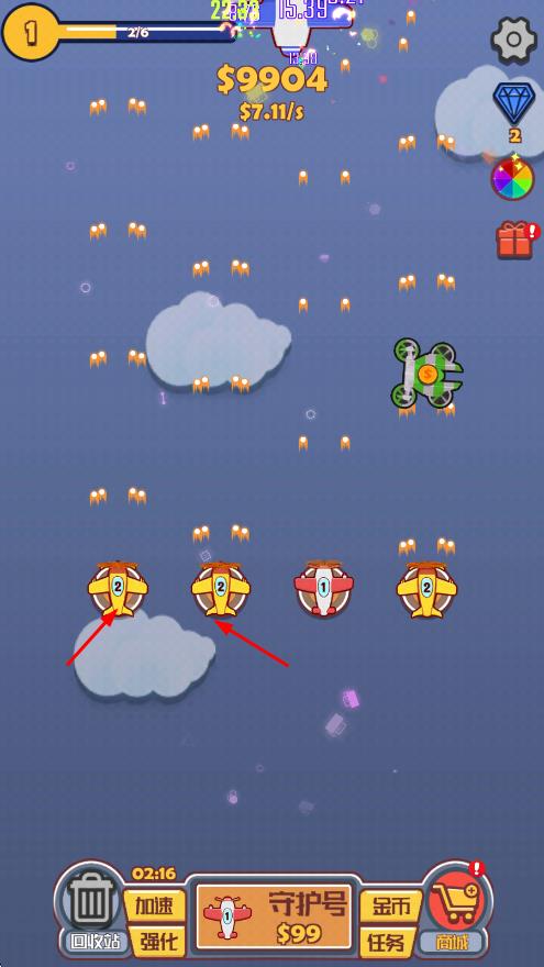 1、進(jìn)入游戲后,放置初始飛機(jī)開(kāi)始自動(dòng)戰(zhàn)斗,將相同等級(jí)的飛機(jī)拖動(dòng)到一起完成合成,解鎖更高階戰(zhàn)機(jī)提升戰(zhàn)力。