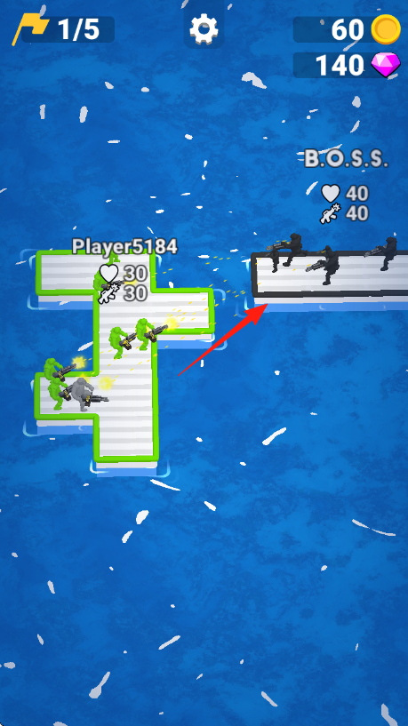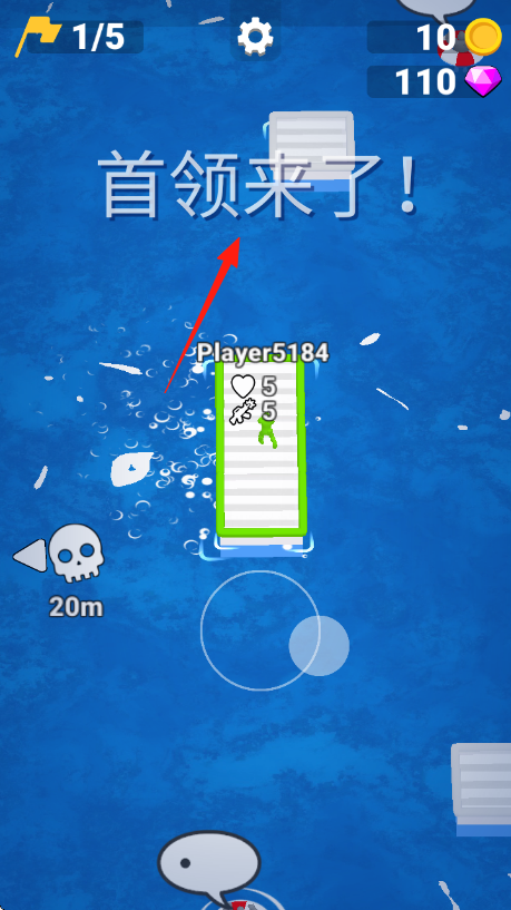 1、開局提示首領(lǐng)來了,操控Player5184,在水上木板移動(dòng),按紅箭頭方向,靠近目標(biāo),注意金幣、鉆石積累,規(guī)劃路線。