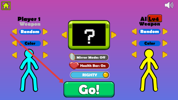 2、在單人對戰(zhàn)設(shè)置頁,選定Player-1武器、顏色等參數(shù),確認(rèn)Mirror-Mode和Health-Bar狀態(tài)后,點擊綠色Go!按鈕,正式進(jìn)入戰(zhàn)斗場景。