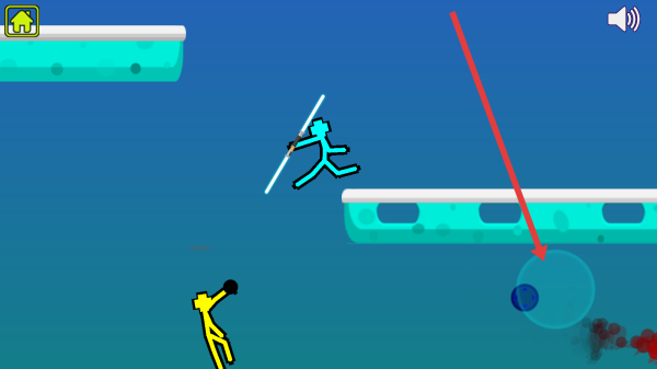 3、戰(zhàn)斗中操控藍(lán)色火柴人,利用武器攻擊黃色AI對手,留意場景右側(cè)可互動的藍(lán)色球體,借助攻擊或拾取道具提升戰(zhàn)斗優(yōu)勢,擊敗敵人。