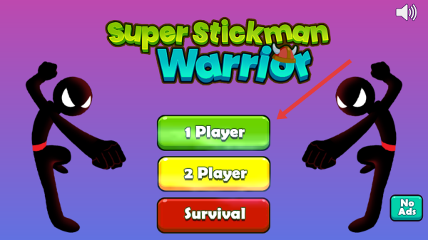 1、在Super-Stickman-Warrior主界面,點擊綠色1-Player按鈕,進(jìn)入單人模式的角色與AI對戰(zhàn)配置界面,開啟單挑對決流程。