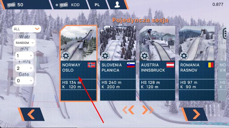 1、進入游戲,在關卡選擇界面,有不同國家的滑雪場地,以及對應的跳臺參數(shù),點擊選擇想要挑戰(zhàn)的滑雪場地關卡。