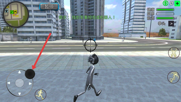 3、游戲內(nèi)操控左側(cè)虛擬搖桿,控制火柴人角色移動,依據(jù)提示在城市場景中搜尋軍事坦克或機(jī)器人,推進(jìn)任務(wù)進(jìn)度。