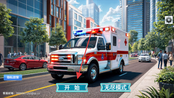 1、在游戲初始界面,有開始和無盡模式兩個選項,點擊開始按鈕,即可進入游戲,開啟你的救護車駕駛冒險之旅。