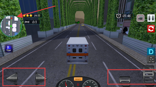 3、通過左側(cè)的方向按鈕控制救護車的移動方向,右側(cè)的按鈕控制加速和減速,根據(jù)屏幕上的提示和地圖,駕駛救護車完成任務,注意時間和距離的限制,提升你的游戲得分和等級。