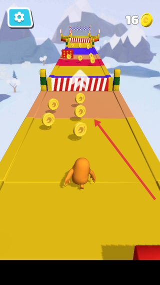 2、沿跑道前行,引導角色躲避障礙,盡可能拾取全部金幣,借助跑道上的加速帶、跳板等道具。