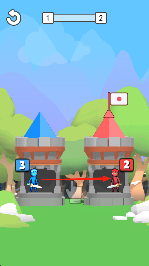 1、關卡1,藍色城堡對紅色城堡,拖動藍色士兵,進攻紅城堡,兵力多者勝,注意上方進度條,推進戰(zhàn)斗進程。