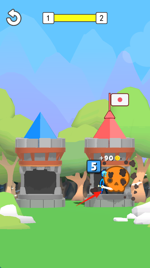 2、戰(zhàn)斗中,藍色士兵占領紅城堡,兵力合并,摧毀紅方防御,獲取金幣,上方進度條滿格,進入下一階段,留意敵方反擊。