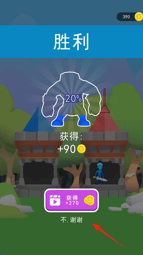 3、勝利界面,顯示獲得金幣、解鎖新戰(zhàn)力,點擊不,謝謝跳過廣告,或看廣告獲更多金幣,積累金幣用于升級城堡、擴充兵力。