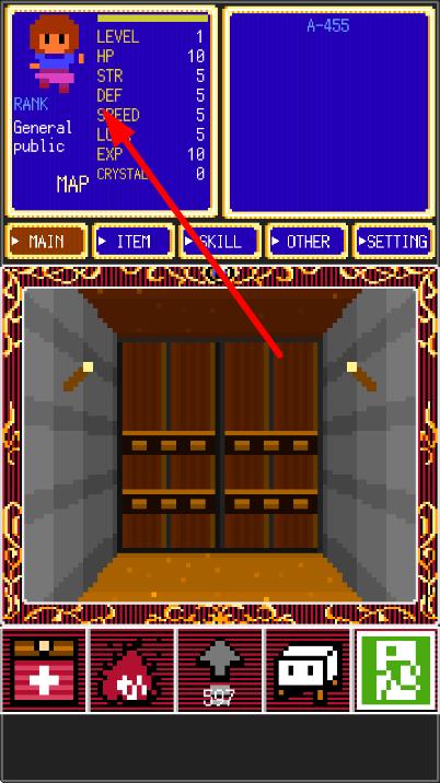 2、進(jìn)入游戲后,查看角色屬性面板,按紅色箭頭指引,點(diǎn)擊MAIN菜單,了解功能,準(zhǔn)備探索地牢。