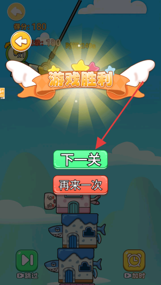 3、當出現(xiàn)游戲勝利界面時,可選擇下一關繼續(xù)挑戰(zhàn),或點擊再來一次重新游玩當前關卡。