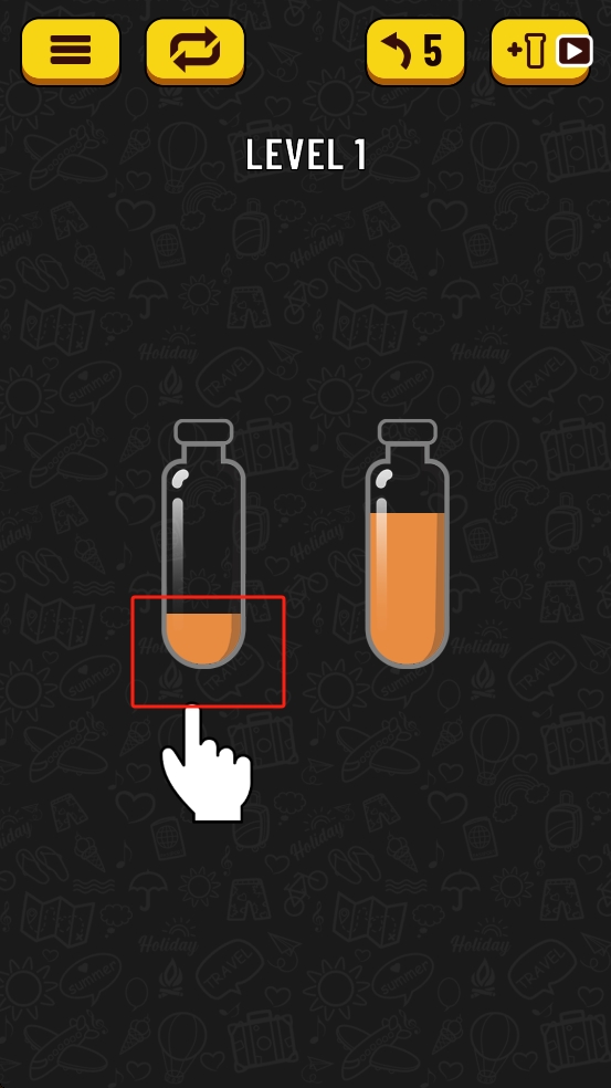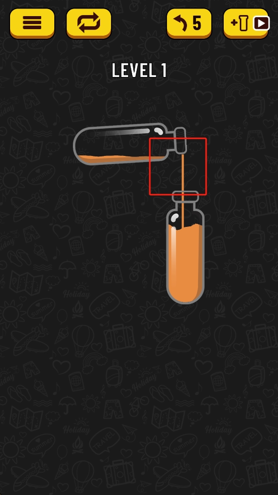 2、將左側(cè)瓶子傾斜,使橙色液體緩緩倒入右側(cè)玻璃瓶,直至右側(cè)瓶子被同色液體裝滿,達(dá)成液體分類的關(guān)卡目標(biāo)。