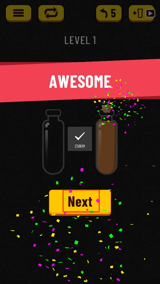3、關(guān)卡完成后,界面彈出AWESOME提示與彩色紙屑,點(diǎn)擊下方的Next按鈕,繼續(xù)挑戰(zhàn)后續(xù)的液體分類關(guān)卡。