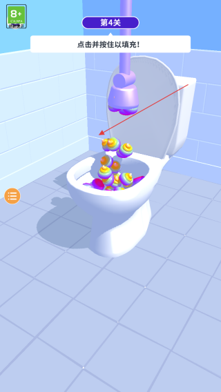 3、在第四關(guān)卡,按提示點擊并按住紫色的裝置,點擊填充馬桶內(nèi)彩色球體就掉落,填充滿則過關(guān)。