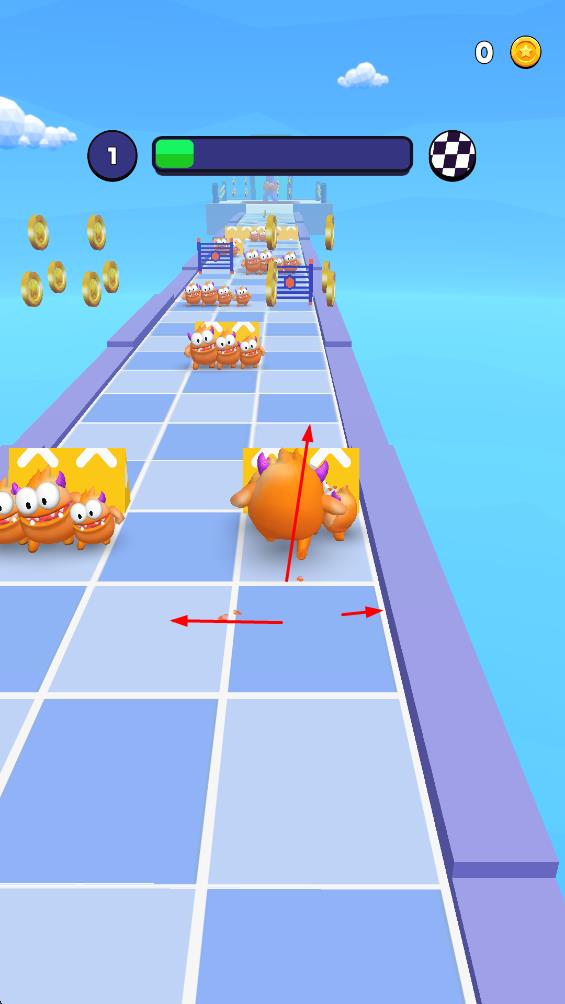 1、左右移動操控怪獸在跑道前進,收集金幣并合并相同小怪獸,壯大隊伍規(guī)模,為后續(xù)挑戰(zhàn)蓄力。