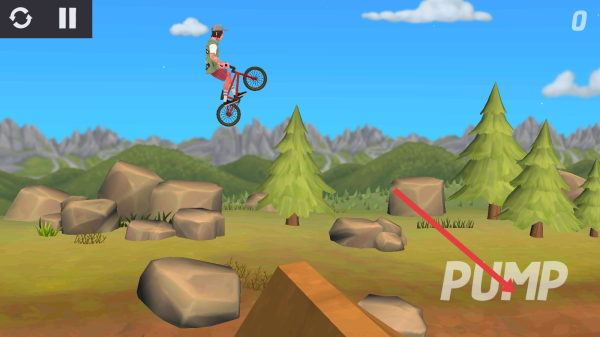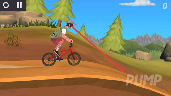 1、開始騎行,點擊右側(cè)的PUMP,用虛擬按鍵控制方向,下坡加速、上坡控制速度,保持平衡過地形。