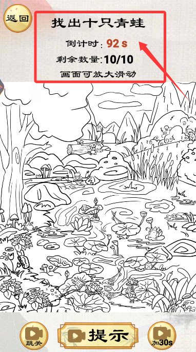 3、根據(jù)關(guān)卡提示的任務(wù)要求,通過縮放和滑動屏幕仔細(xì)搜尋畫面中的隱藏目標(biāo)。
