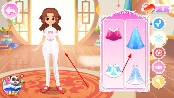 2、通過點擊右側(cè)的其他圖標(biāo),選擇配飾、發(fā)型等進(jìn)行搭配,完成換裝后,公主可以進(jìn)入展示場景,展示精心打扮后的形象。