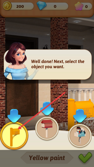 1、開啟游玩進(jìn)入裝飾房間的頁(yè)面,按指引選目標(biāo)的裝飾,按照自己的喜好選擇,點(diǎn)綠色對(duì)勾確認(rèn)。