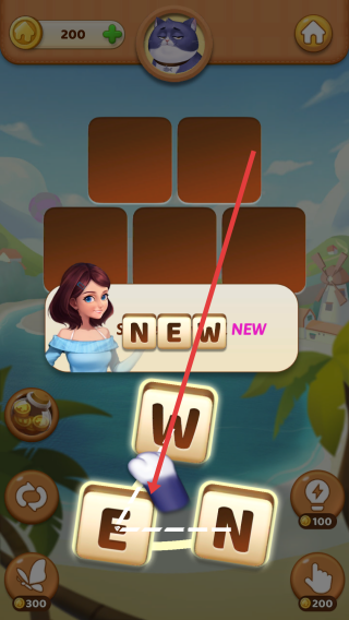 2、進(jìn)入單詞解謎環(huán)節(jié),滑動(dòng)字母拼單詞比如NEW,按照順序滑動(dòng),并填滿上方空格,完成關(guān)卡獲獎(jiǎng)勵(lì)。
