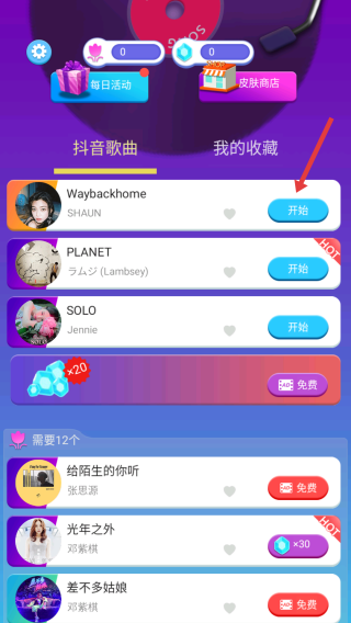 1、在游戲中,選擇一首自己喜歡的歌曲,點(diǎn)擊開始按鈕,開啟音樂游戲之旅。