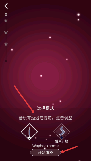 2、進(jìn)入游戲后,若音樂有延遲或提前的情況,可點(diǎn)擊相應(yīng)按鈕進(jìn)行調(diào)整,以獲得更好的游戲體驗(yàn),調(diào)整好后,點(diǎn)擊開始游戲按鈕,正式進(jìn)入游戲。