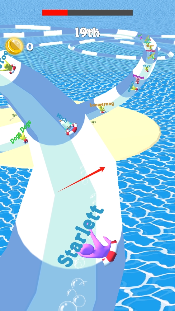2、游戲中,靈活控制角色在水滑道上滑行,巧妙避開障礙,超越其他玩家如Starlett、boomerang等,滑動移動人物。