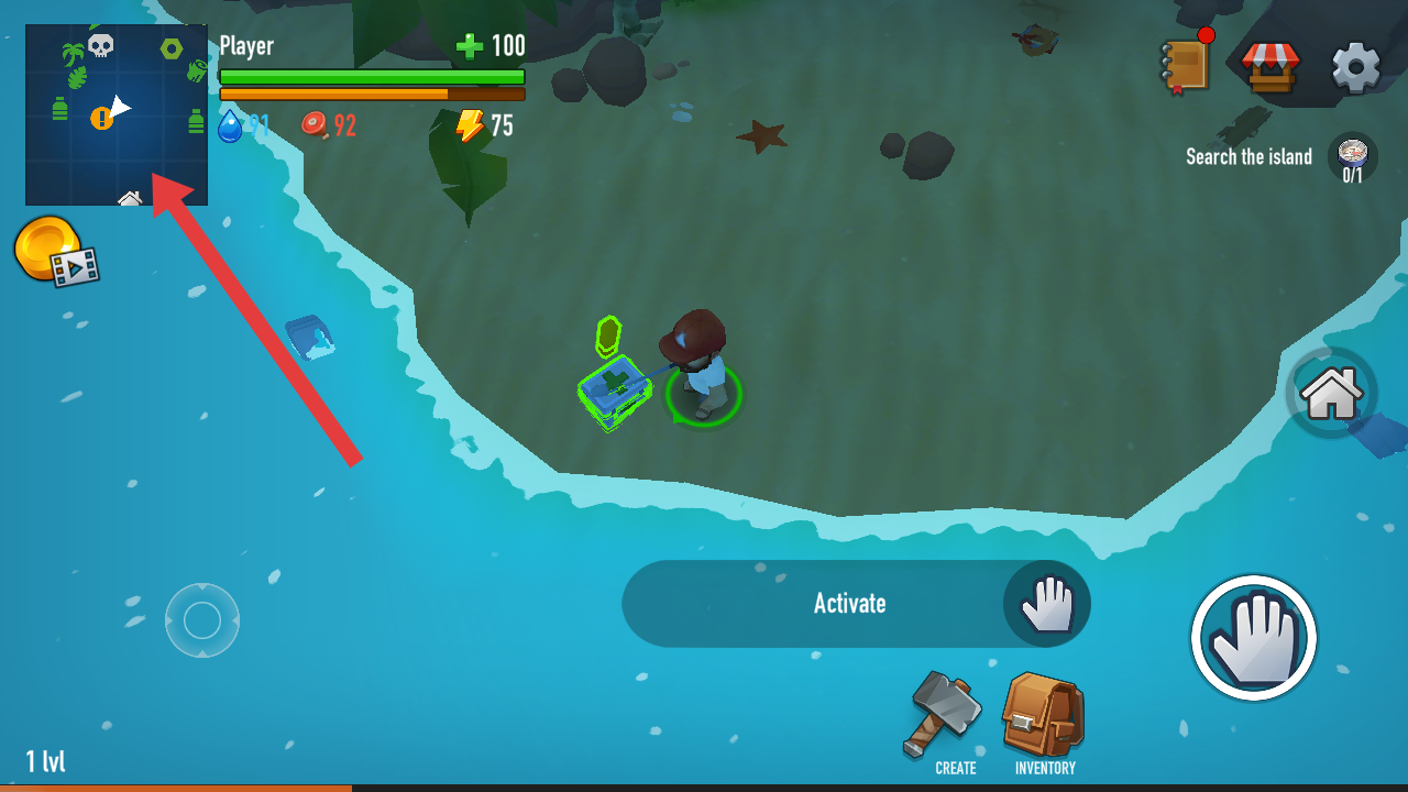 3、關(guān)注左上角地圖的區(qū)域,跟隨黃色感嘆號(hào)標(biāo)記,前往島嶼完成Search the island探索任務(wù)。