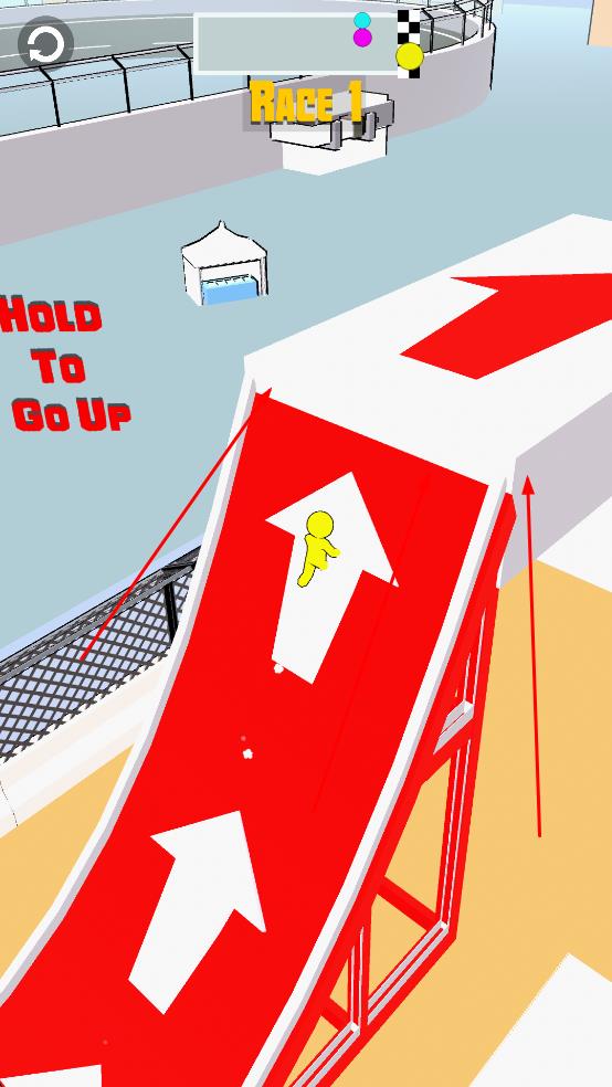 3、按住屏幕控制角色上坡,朝著終點目標(biāo)努力,同時留意對手位置,爭取率先沖線。