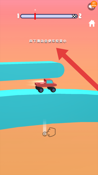 1、界面顯示第一個的場景,需要根據(jù)文字提示:向下滑動會使車輪變小,可以根據(jù)障礙物進(jìn)行操作。