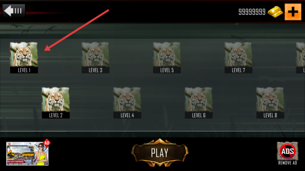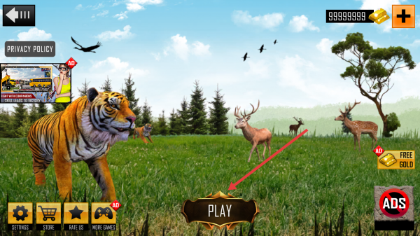1、點(diǎn)擊PLAY進(jìn)入野生動(dòng)物模擬游戲,選LEVEL1操控老虎開(kāi)局,目標(biāo)鎖定場(chǎng)景內(nèi)河馬,借地圖標(biāo)記找方位。