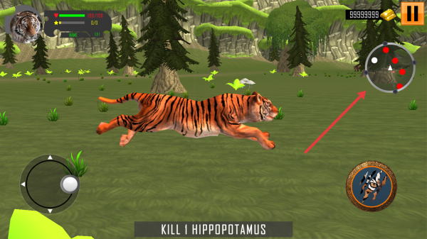 2、用左側(cè)搖桿控老虎移動(dòng),避開(kāi)鹿群等干擾,遇河馬,緊盯血條,靠撲咬、連擊輸出,留意自身血量回滿。