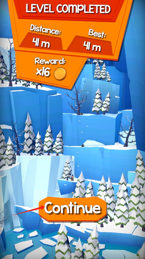 3、成功完成當(dāng)前關(guān)卡后,進(jìn)入關(guān)卡完成界面,界面顯示當(dāng)前距離、最佳距離以及獲得的獎(jiǎng)勵(lì)金幣數(shù)量,點(diǎn)擊Continue,繼續(xù)。