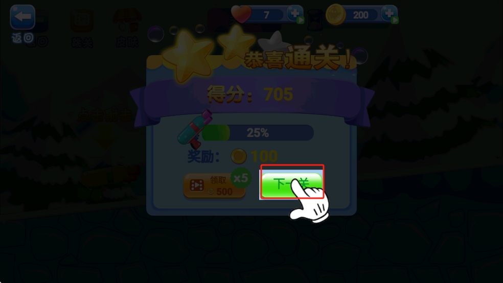 3、通關(guān)結(jié)算后,點(diǎn)擊綠色的下一關(guān)按鈕,進(jìn)入難度升級的破冰場景,應(yīng)對更復(fù)雜的冰層布局與目標(biāo)困境。