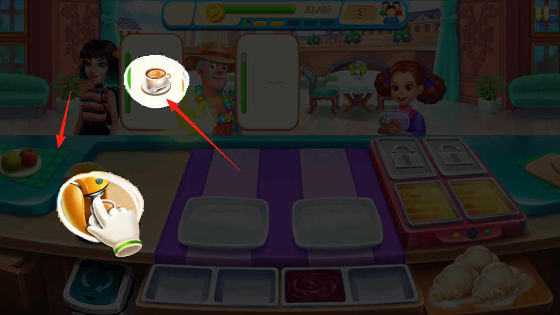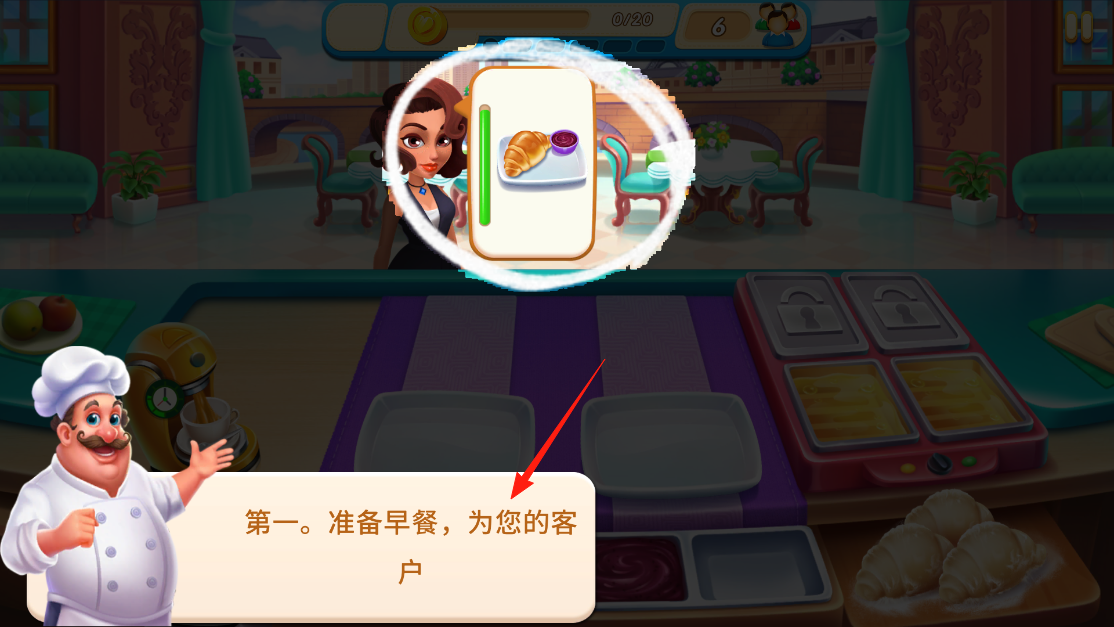 1、廚師給你派活啦,要準(zhǔn)備早餐招待客人,先看上方訂單提示,清楚客人要的早餐樣式,然后去準(zhǔn)備對應(yīng)的食材,開啟早餐制作流程。