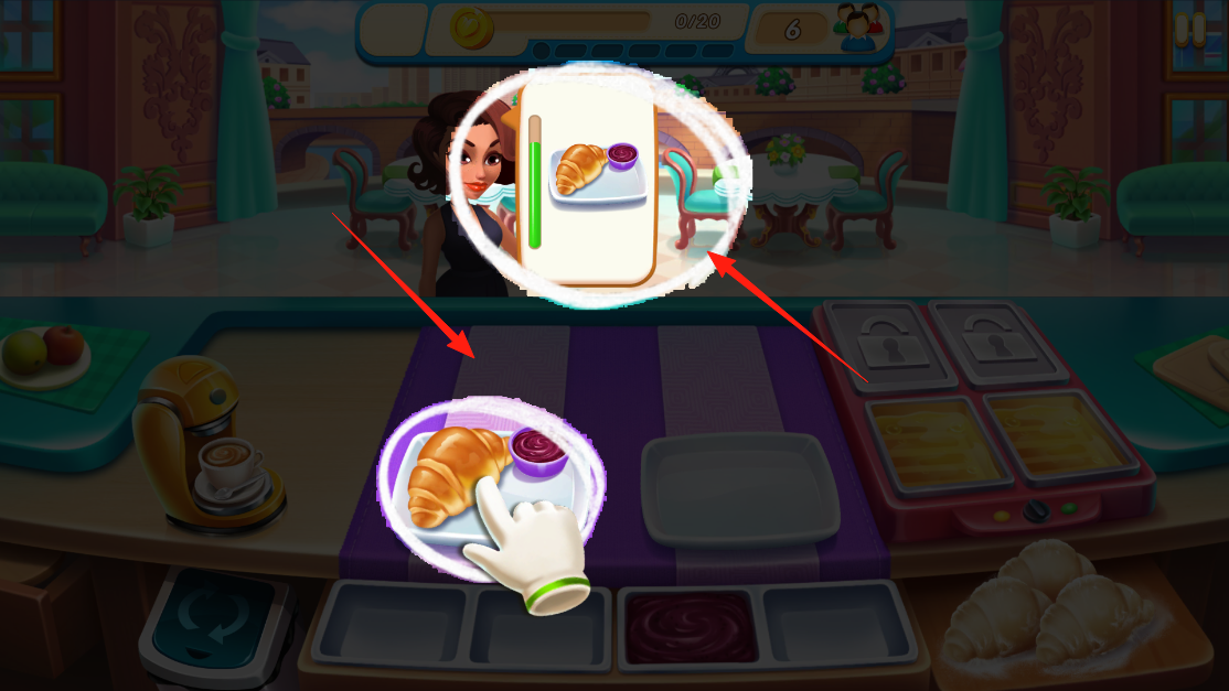 3、挑戰(zhàn)關(guān)卡獲取獎勵:參與大量關(guān)卡挑戰(zhàn),完成每個關(guān)卡的特定任務(wù),在規(guī)定條件下達成目標(biāo),成功通關(guān)后可獲得獎勵,用于購買食材、升級設(shè)備或裝推動餐廳持續(xù)發(fā)展。
