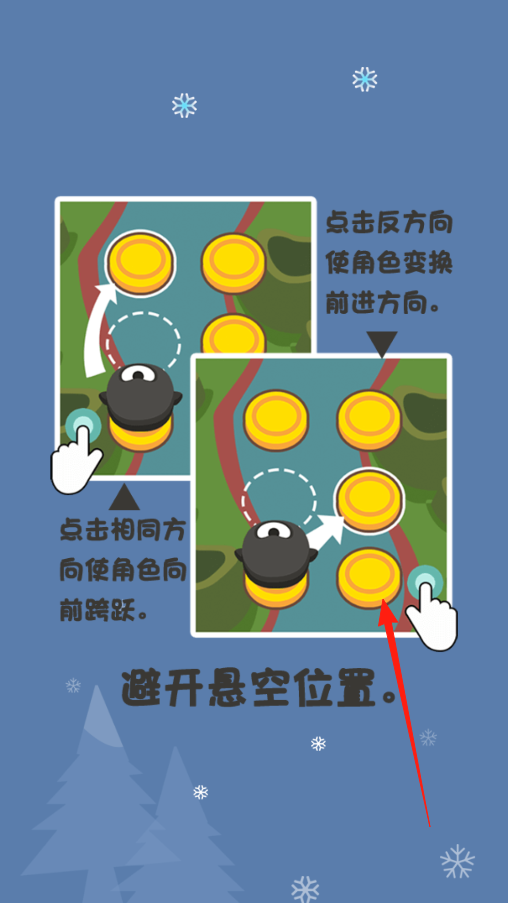 2、游戲開局有操作教學(xué),得記住兩種點(diǎn)擊方式,點(diǎn)相同方向讓角色往前跳,點(diǎn)反方向能切換前進(jìn)方向,跟著提示多練練,避開懸空位置,別讓角色掉下去。