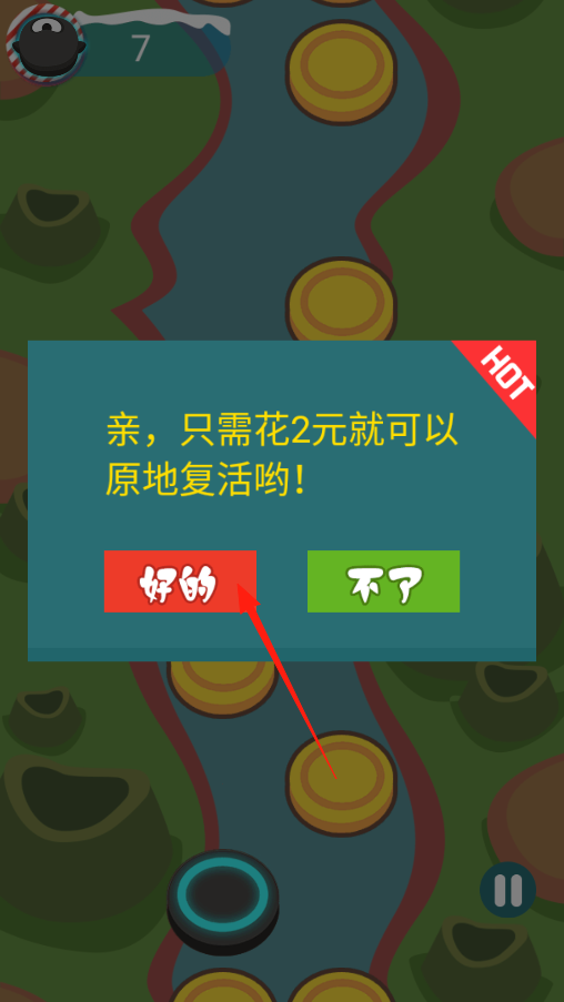 3、要是闖關(guān)時(shí)角色掉下去失敗了,會(huì)彈出復(fù)活提示,想花2元原地復(fù)活接著玩,就點(diǎn)好的,要是想重新開始挑戰(zhàn),選不了就行,看自己心情決定咋繼續(xù)游戲。