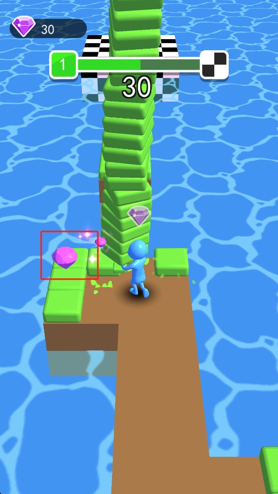2、游玩中引導(dǎo)小人移動(dòng),收集散落的紫色寶石,堆疊綠色磚塊構(gòu)建向上通道,保持平衡避免落水。