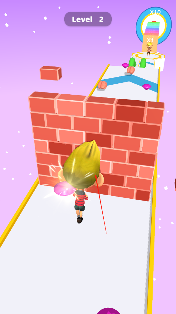 2、前方會(huì)出現(xiàn)一列墻壁,靠近會(huì)利用腦袋撞碎墻壁,撞一次頭會(huì)變小一點(diǎn),即可通過(guò)障礙。