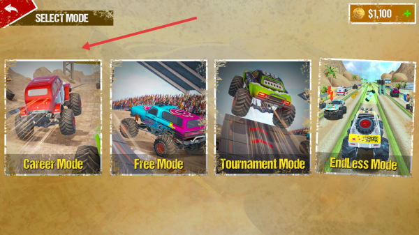 1、點擊START RACE,進入REAL MONSTER TRUCK RACING,選Career Mode開啟生涯賽事,駕駛藍色怪獸卡車備戰(zhàn)。