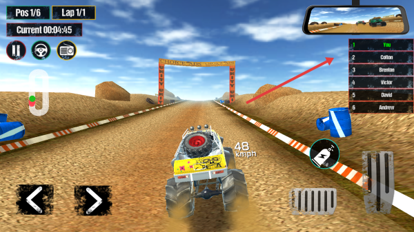2、比賽時,用左右按鍵控方向,遇坡道、障礙,把握時機加速右下角油門,騰空時微調(diào)車身防側(cè)翻。