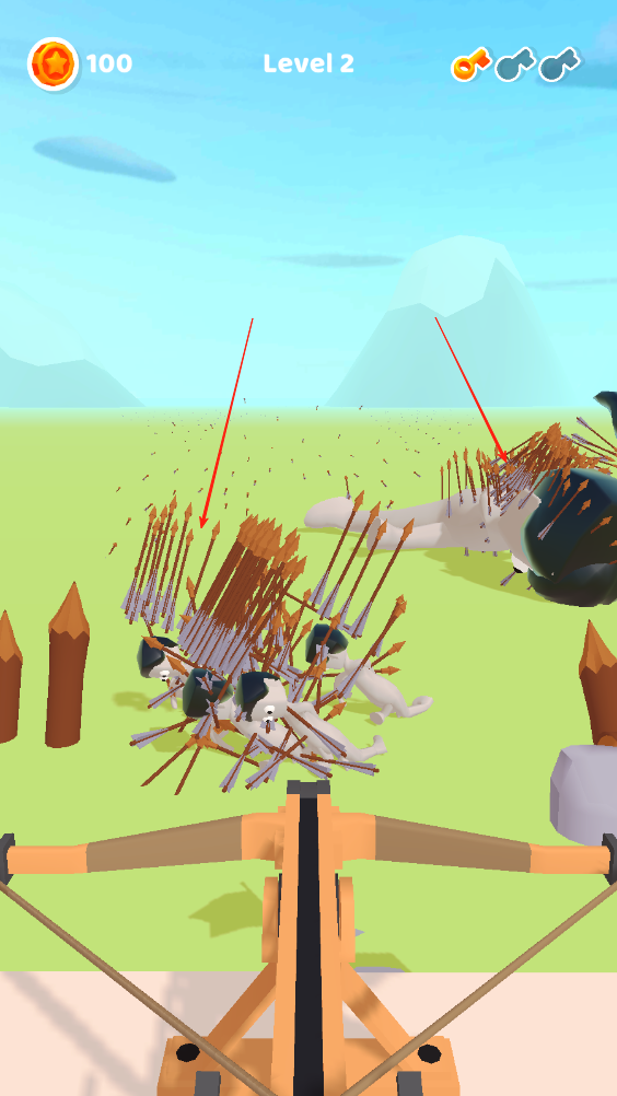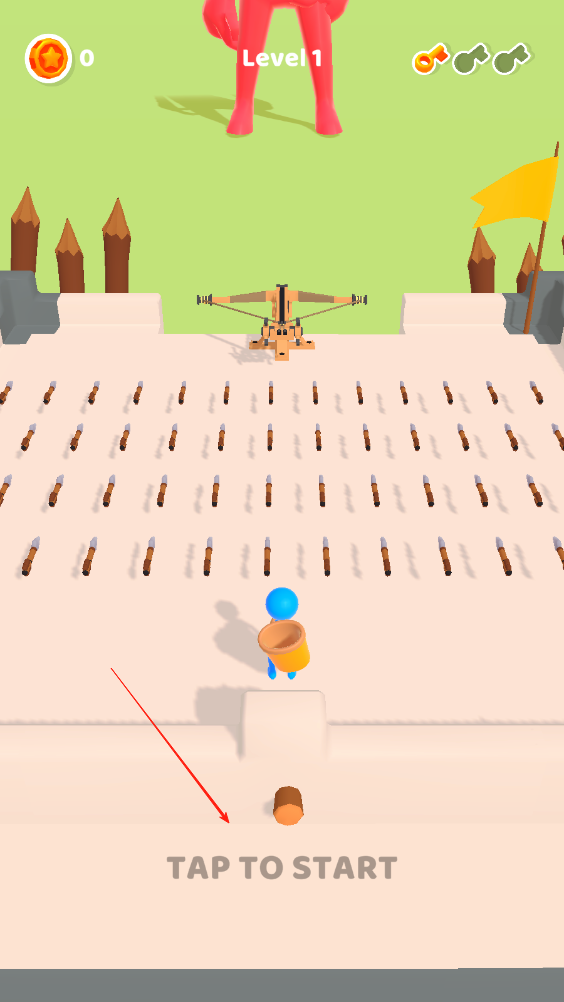 1、點(diǎn)擊開始移動小人收集前方散落在地的箭矢,在巨人靠近之前,靠近箭弩,將收集到的箭全部發(fā)射出去。