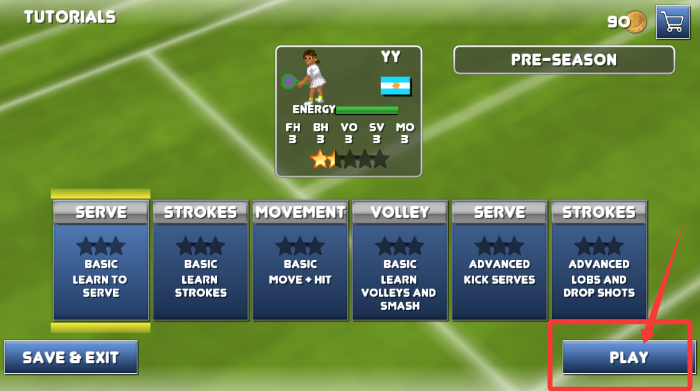 3、完成基礎(chǔ)教學(xué)后,點擊比賽按鈕正式進(jìn)入網(wǎng)球競技場景中。